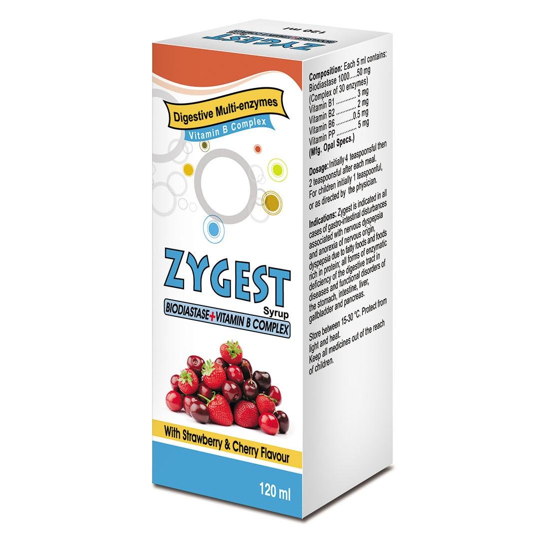 ZYGEST Syrup contains digestive enzyme ingredients (including Fungal Diastase and Pepsin as per formulation) that help improve digestion and relieve common digestive discomfort. These enzymes work by breaking down food components, making digestion easier and reducing symptoms such as bloating, heaviness, gas, and indigestion.