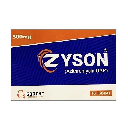ZYSON 500MG Tablets contain Azithromycin 500mg, a broad-spectrum antibiotic used to treat various bacterial infections affecting the respiratory tract, skin, throat, and other parts of the body. It works by stopping the growth of bacteria and helps the body recover effectively when taken as prescribed by a healthcare professional.